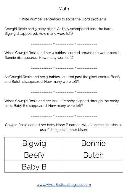 This book is great for PreK and K students. If you're working on the letter B, Rosie's five baby bison have letter B names. She takes them on an adventure and then loses one or two each time. Like Two Peas in a Pod, there are twins in this book! Them being twins doesn't affect the plot, other than them getting lost at the same time, while the singletons disappeared individually. My son and I enjoyed subtracting and saying number sentences that went along with what was happening on the pages. Download the free activity printables here.
